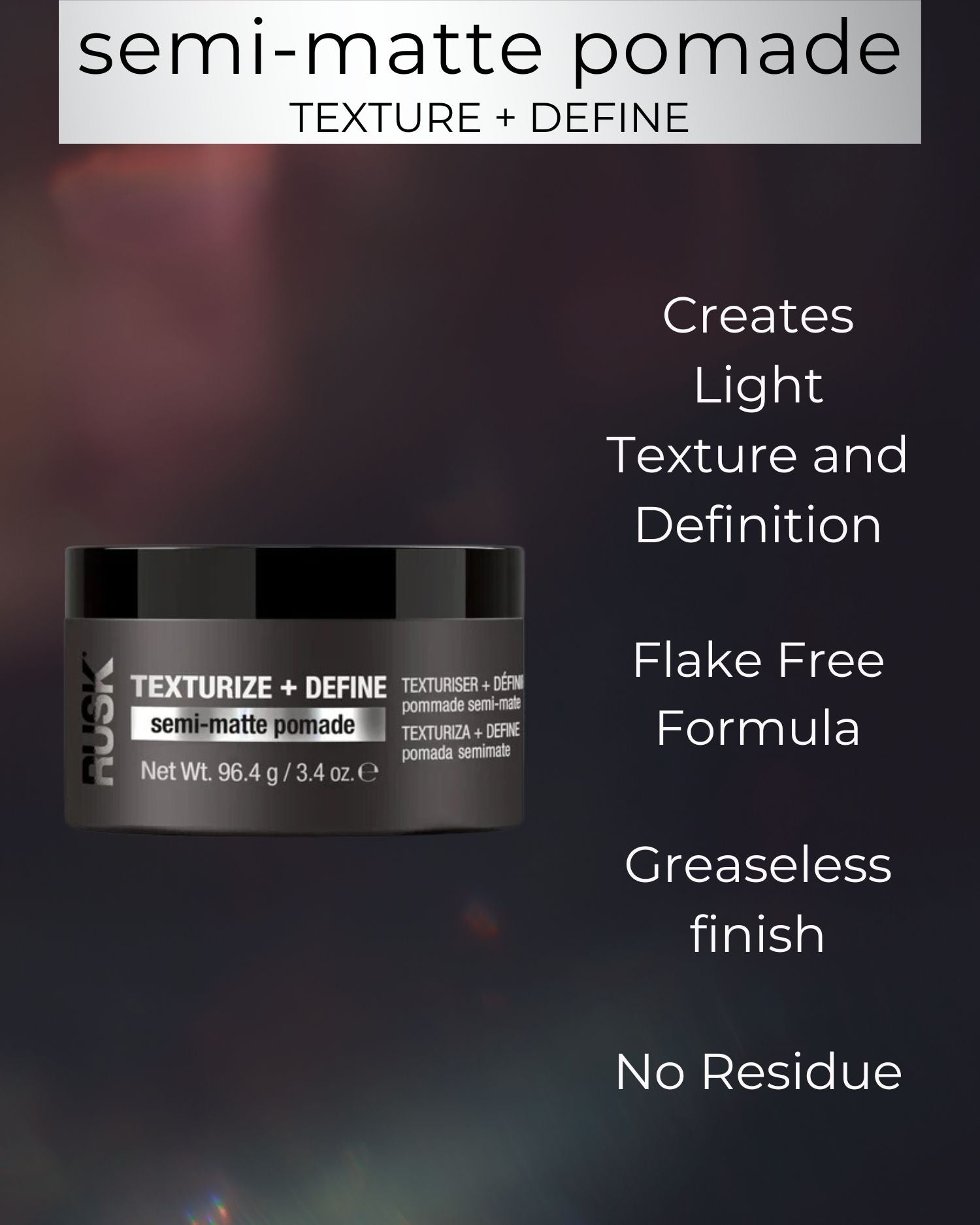 Buildable pomade for texture and definition. Delivers a non-sticky, greaseless finish to create versatile looks without residue. Provides protection against environmental stress such as humidity and pollution.